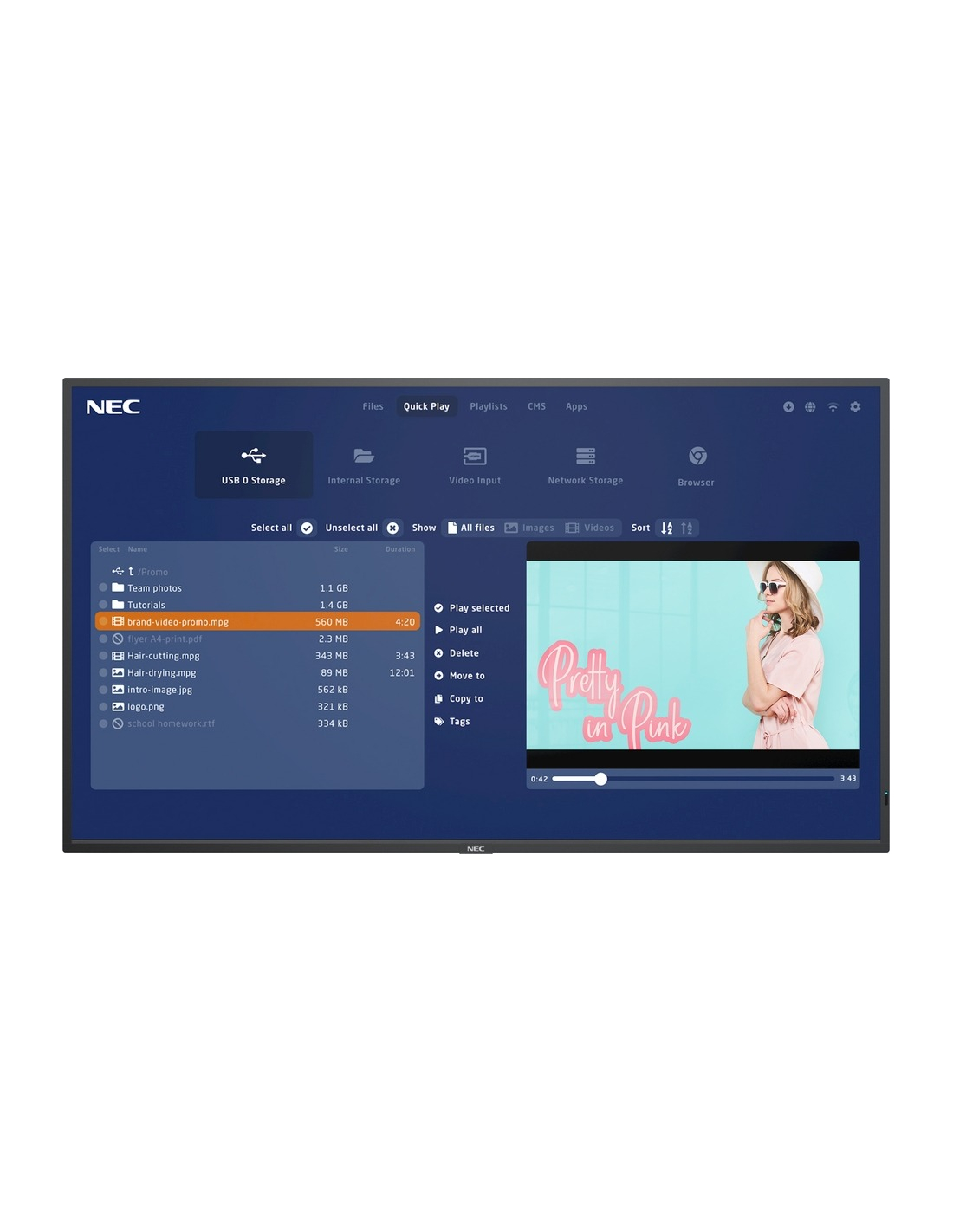 Pour les demandes de fonctionnalités spécifiques, le NEC MediaPlayer facilite la commutation directement sur les systèmes de gestion de contenu intégrés.