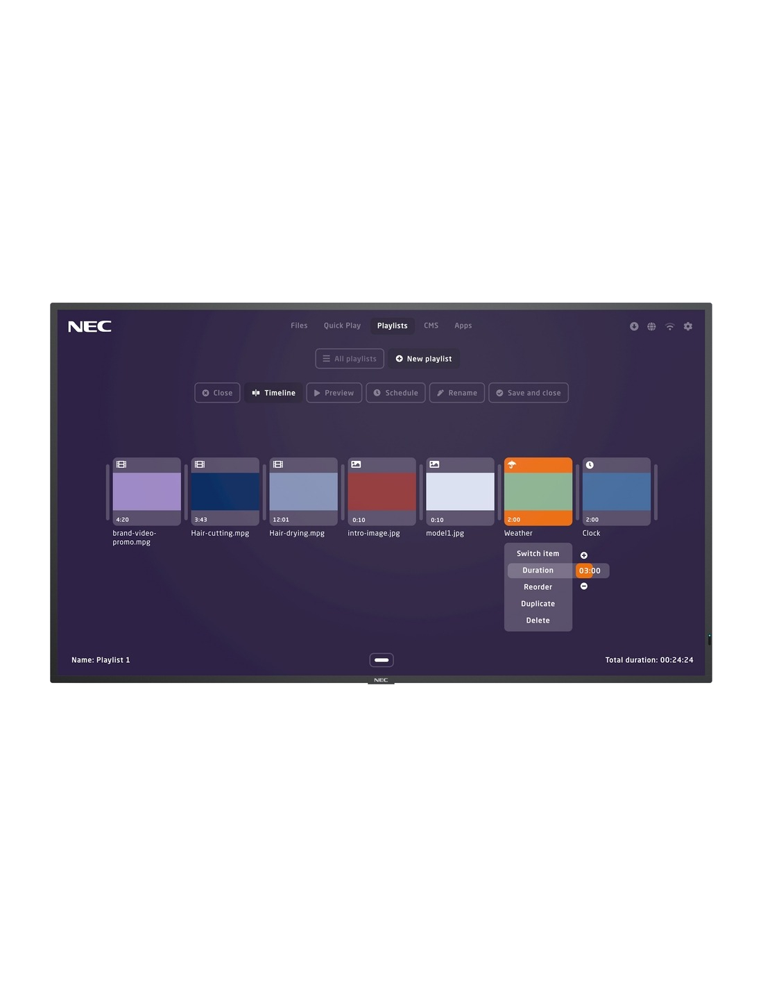 Pour les demandes de fonctionnalités spécifiques, le NEC MediaPlayer facilite la commutation directement sur les systèmes de gestion de contenu intégrés.