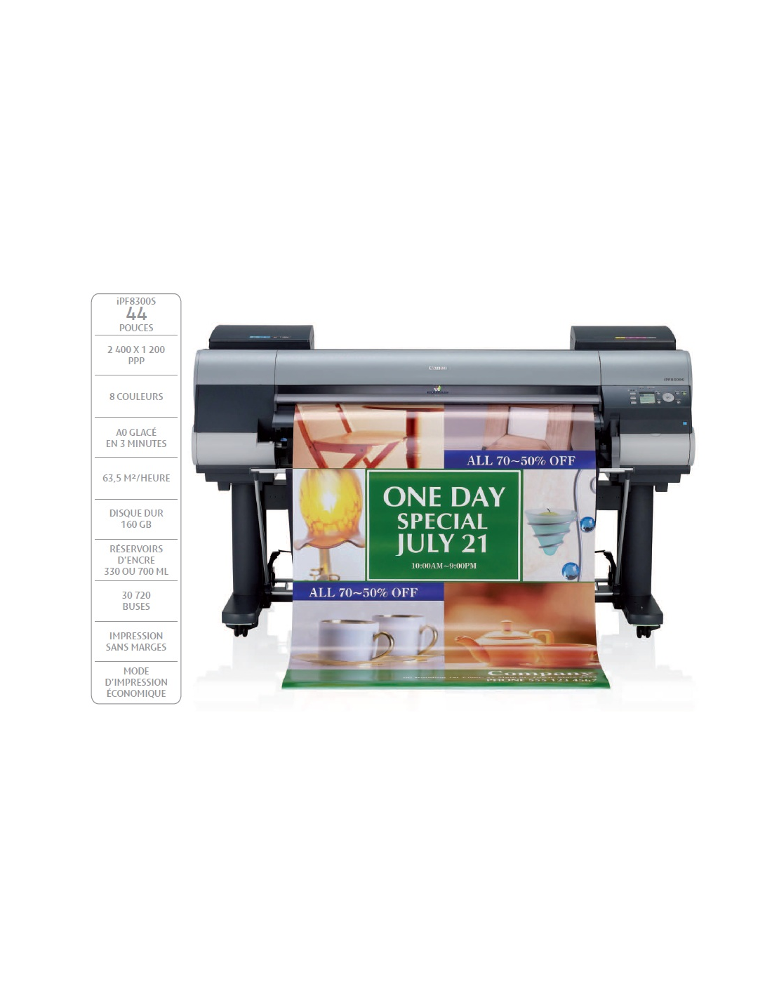 L'iPF8300S offre des vitesses d'impression étonnantes : jusqu'à 63,5 m²/h*. Grâce à son disque dur intégré de 160 Go, vous pouvez stocker vos travaux d'impression et y accéder aisément depuis le panneau de commandes LCD. Vous avez le choix entre des réservoirs d'encre à haute capacité de 330 ou 700 ml, que vous pouvez remplacer en cours d'impression. Grâce à la technologie d'impression sans marge (jusqu'à 106 centimètres), vous n'avez plus besoin de découper vos impressions. Vous gagnez ainsi un temps précieux et augmentez votre productivité. Compatible avec la technologie Gigabit Ethernet, l'iPF8300S permet le transfert rapide des données, y compris pour vos fichiers volumineux et vos travaux d'impression par lots.