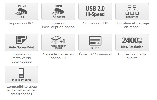 Prise en charge de PCL5e/6 et (en option) d'Adobe® PostScript