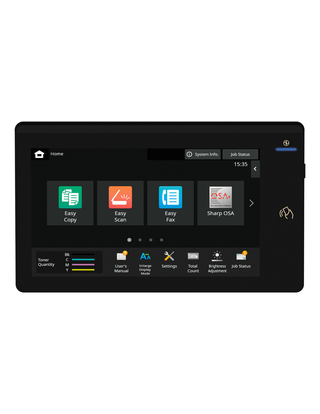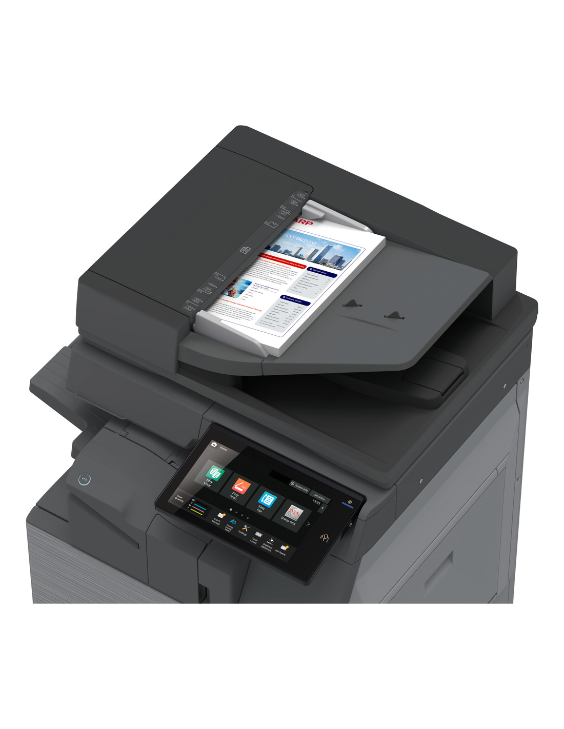 Un capteur de mouvement réveille le système du mode veille dès qu'un utilisateur s'approche. Des voyants de communication indiquent l'état du MFP et des icônes intuitives sur le panneau de commande LCD couleur inclinable de 10,1 pouces facilitent l'accès à toutes les fonctions grâce à un fonctionnement tactile similaire à celui d'un smartphone.