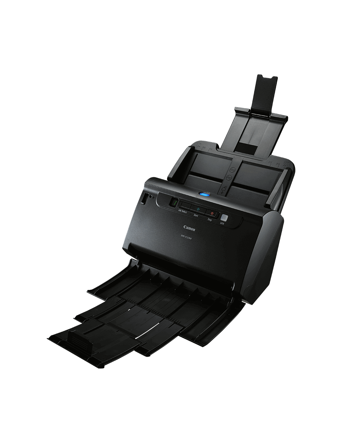 Carte embossée ou document long (jusqu'à 3 m), le DR-C230 prend en charge de très nombreux types de supports. La conception unique du bac vous permet de numériser avec le bac de sortie en position ouverte, semi-ouverte ou fermée pour optimiser l'espace de bureau. La fiabilité des numérisations est garantie par le système de dégagement en cas de double alimentation, qui permet à l'utilisateur d'ignorer le problème et de poursuivre la tâche dans certains cas précis (traitement d'une enveloppe ou d'un document sur lequel un post-it est apposé, par exemple).